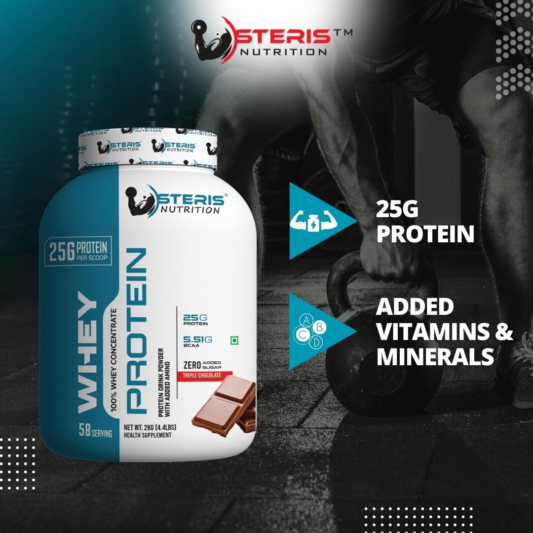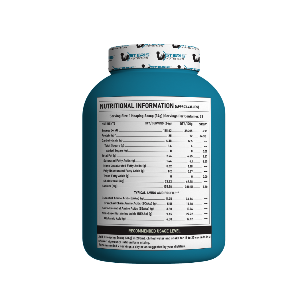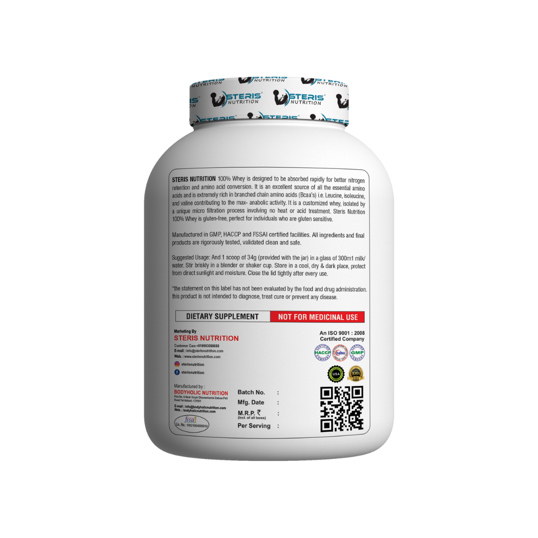 - Steris Nutrition WHEY PROTEIN is 100% Imported Whey Protein Isolate supplement powder and delivers 25g of protein, 5.51g BCAAs per serving.